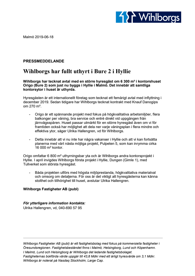 • Wihlborgs har fullt uthyrt i Bure 2 i Hyllie
