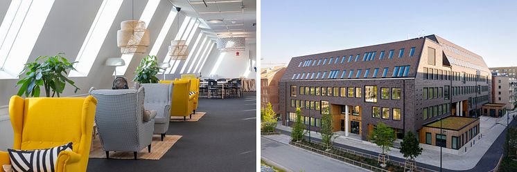 – Hemmakänslan har fångats på olika sätt i arkitekturen, exempelvis genom snedtaket på de översta planen som gör att det känns mysigare än ett ”vanligt” kontor. Lokalerna är dessutom väldigt ljusa, med rejäla fönsterpartier som ger fria utblickar. Här finns också 13 balkonger som är stora som takterrasser.