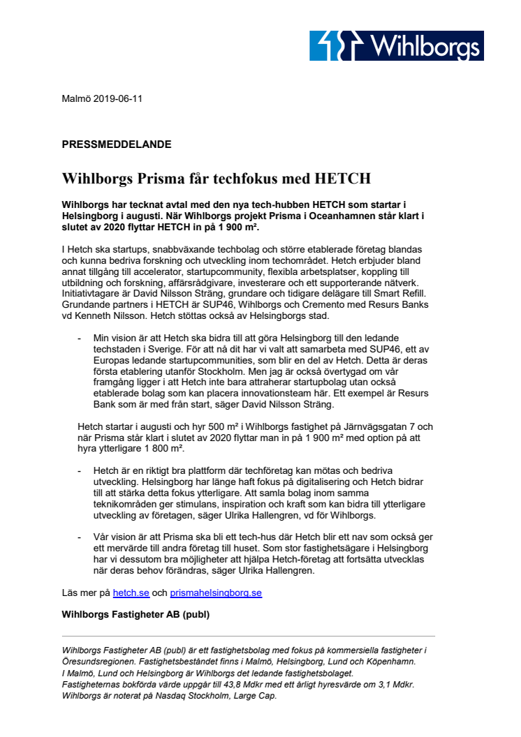 Wihlborgs har tecknat avtal med den nya tech-hubben HETCH som startar i Helsingborg i augusti. När Wihlborgs projekt Prisma i Oceanhamnen står klart i slutet av 2020 flyttar HETCH in på 1 900 m².
