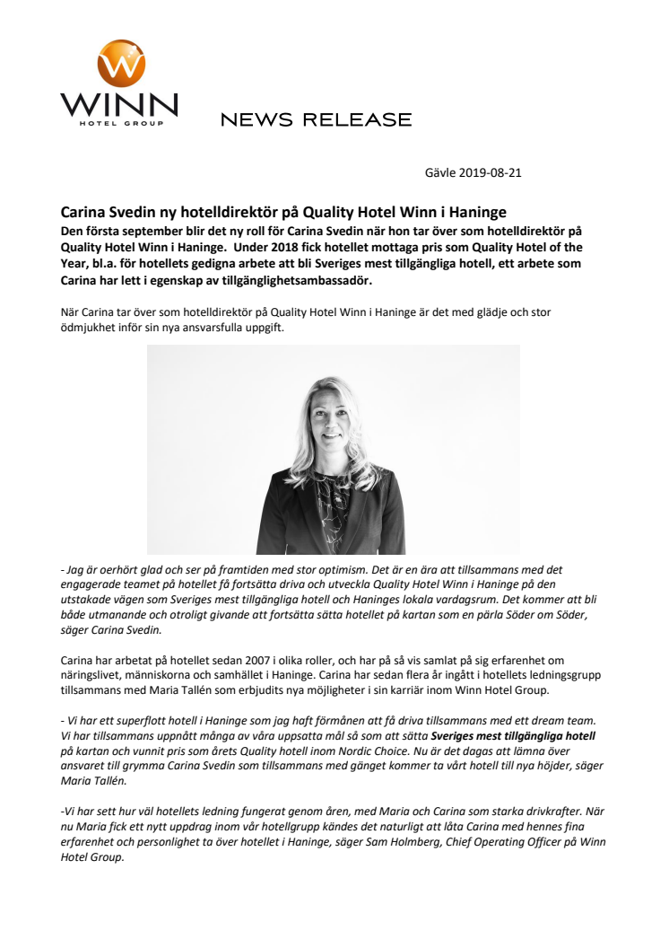 Den första september blir det ny roll för Carina Svedin när hon tar över som hotelldirektör på Quality Hotel Winn i Haninge. Under 2018 fick hotellet mottaga pris som Quality Hotel of the Year, bl.a. för hotellets gedigna arbete att bli Sveriges mest tillgängliga hotell, ett arbete som Carina har lett i egenskap av tillgänglighetsambassadör.