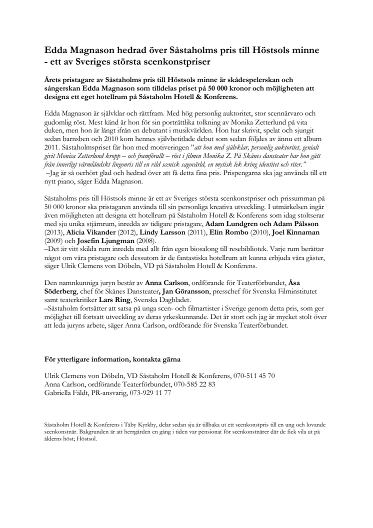 Årets pristagare av Såstaholms pris till Höstsols minne är skådespelerskan och sångerskan Edda Magnason som tilldelas priset på 50 000 kronor och möjligheten att designa ett eget hotellrum på Såstaholm Hotell & Konferens.