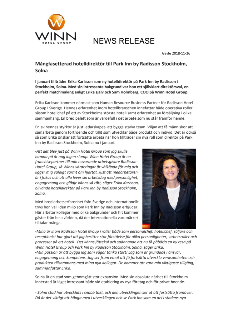 I januari tillträder Erika Karlsson som ny hotelldirektör på Park Inn by Radisson i Stockholm, Solna. Med sin intressanta bakgrund var hon ett självklart direktörsval, en perfekt matchmaking enligt Erika själv och Sam Holmberg, COO på Winn Hotel Group.