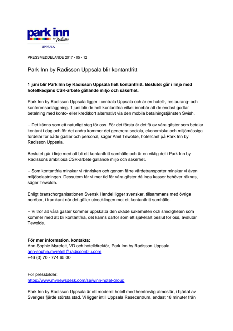 1 juni blir Park Inn by Radisson Uppsala helt kontantfritt. Beslutet går i linje med hotellkedjans CSR-arbete gällande miljö och säkerhet.
