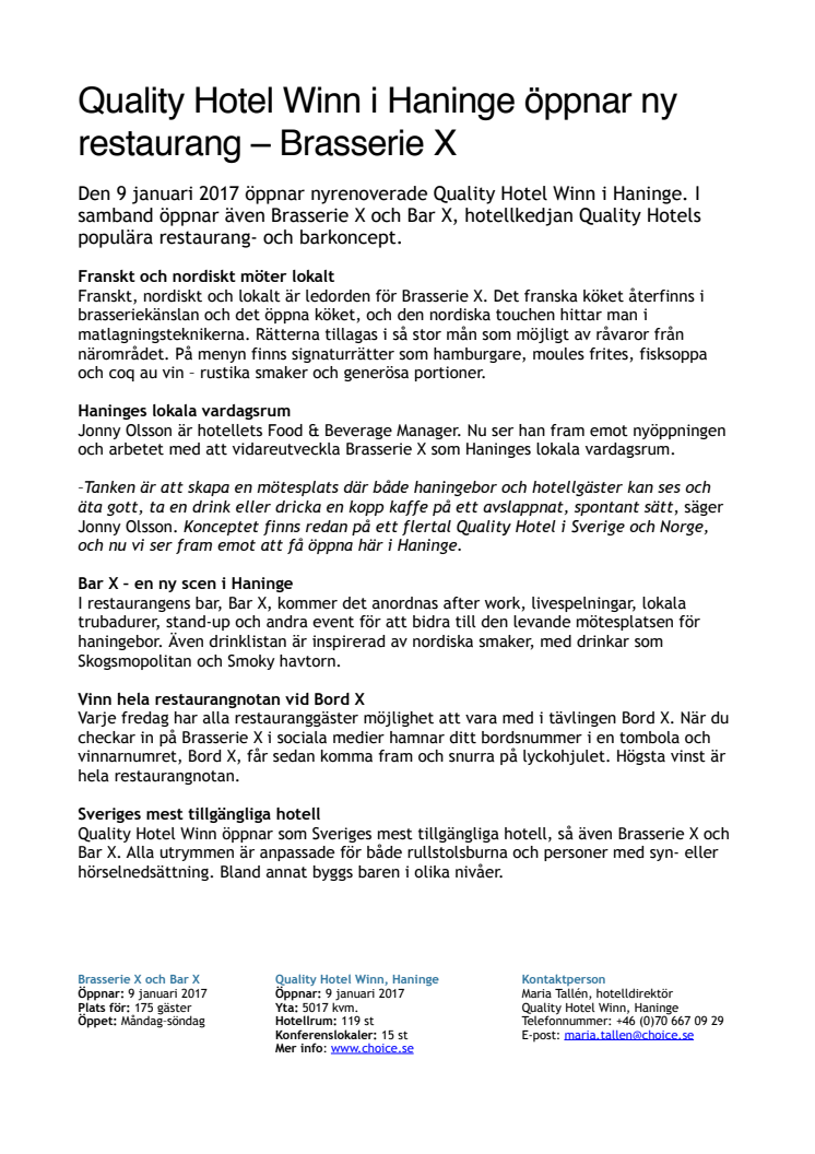 Den 9 januari 2017 öppnar nyrenoverade Quality Hotel Winn i Haninge. I samband öppnar även Brasserie X och Bar X, hotellkedjan Quality Hotels populära restaurang- och barkoncept.