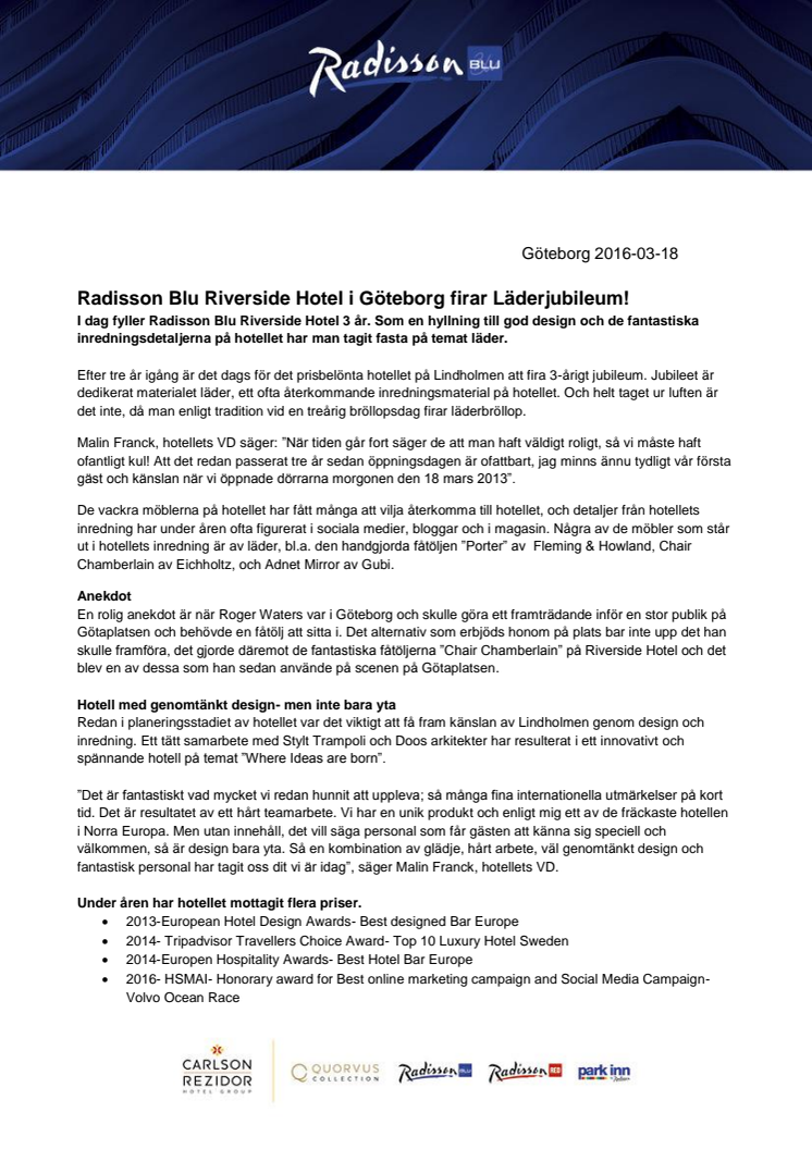 I dag fyller Radisson Blu Riverside Hotel 3 år. Som en hyllning till god design och de fantastiska inredningsdetaljerna på hotellet har man tagit fasta på temat läder. Jubileet är dedikerat materialet läder, ett ofta återkommande inredningsmaterial på hotellet. Och helt taget ur luften är det inte, då man enligt tradition vid en treårig bröllopsdag firar läderbröllop.