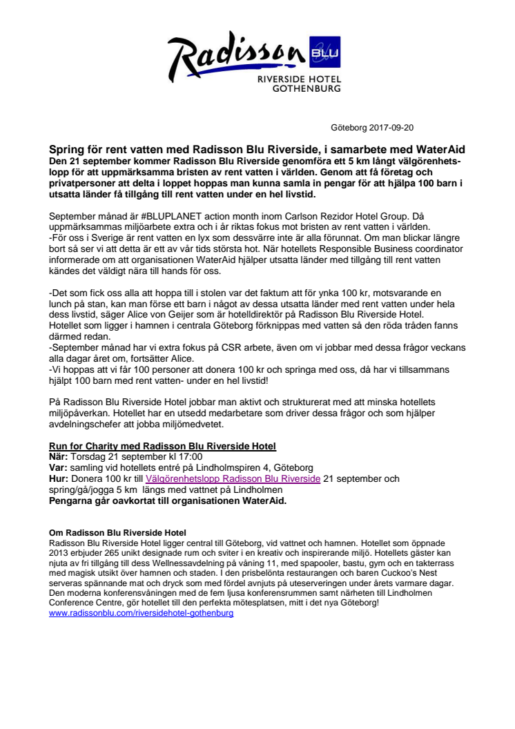Den 21 september kommer Radisson Blu Riverside genomföra ett 5 km långt välgörenhets-lopp för att uppmärksamma bristen av rent vatten i världen. Genom att få företag och privatpersoner att delta i loppet hoppas man kunna samla in pengar för att hjälpa 100 barn i utsatta länder få tillgång till rent vatten under en hel livstid.