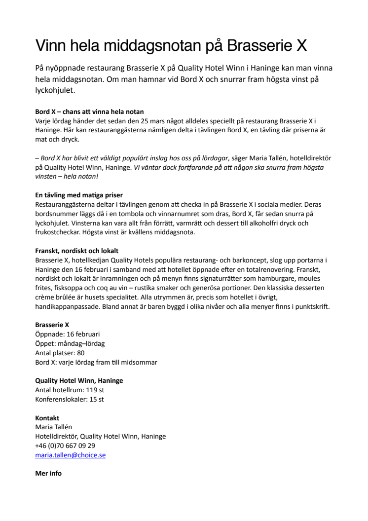 På nyöppnade restaurang Brasserie X på Quality Hotel Winn i Haninge kan man vinna hela middagsnotan. Om man hamnar vid Bord X och snurrar fram högsta vinst på lyckohjulet.