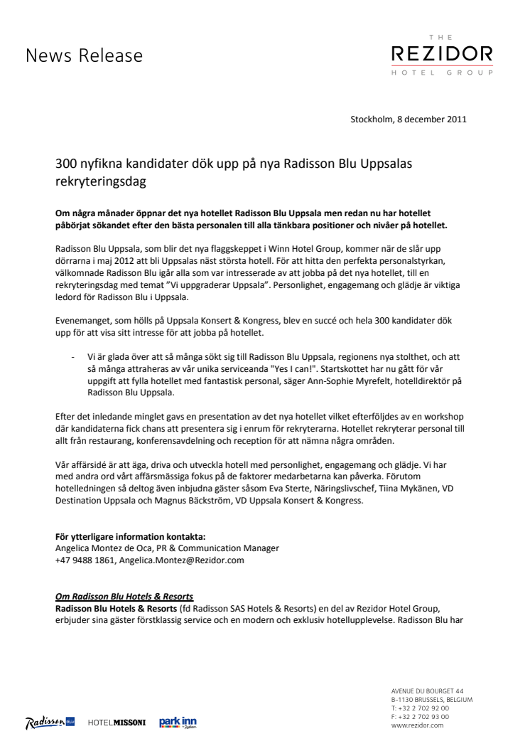 Om några månader öppnar det nya hotellet Radisson Blu Uppsala men redan nu har hotellet påbörjat sökandet efter den bästa personalen till alla tänkbara positioner och nivåer på hotellet. Radisson Blu Uppsala, som blir det nya flaggskeppet i Winn Hotel Group, kommer när de slår upp dörrarna i maj 2012 att bli Uppsalas näst största hotell.