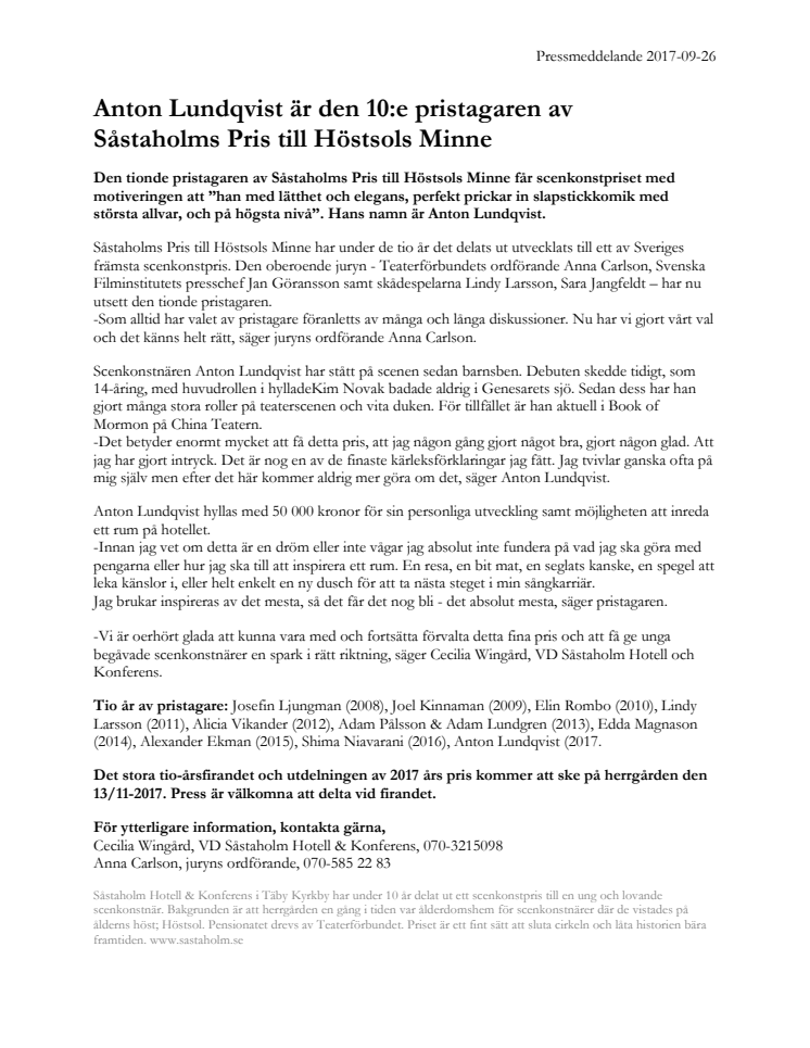 Den tionde pristagaren av Såstaholms Pris till Höstsols Minne får scenkonstpriset med motiveringen att ”han med lätthet och elegans, perfekt prickar in slapstickkomik med största allvar, och på högsta nivå”. Hans namn är Anton Lundqvist.