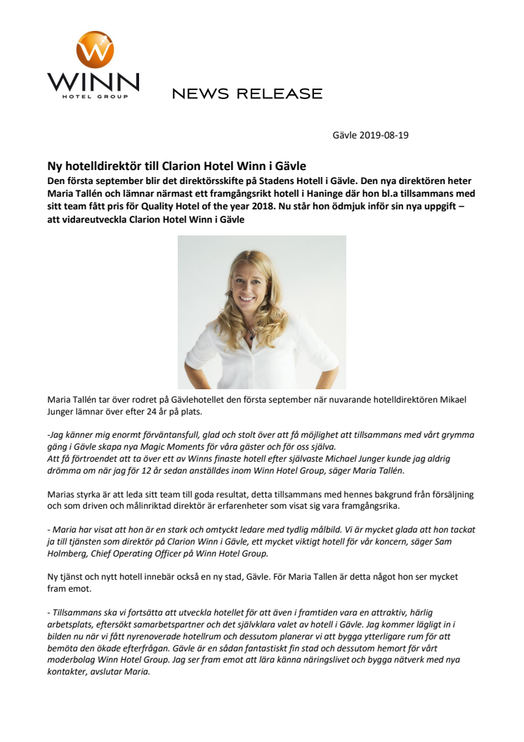 - Maria har visat att hon är en stark och omtyckt ledare med tydlig målbild. Vi är mycket glada att hon tackat ja till tjänsten som direktör på Clarion Winn i Gävle, ett mycket viktigt hotell för vår koncern, säger Sam Holmberg, Chief Operating Officer på Winn Hotel Group.