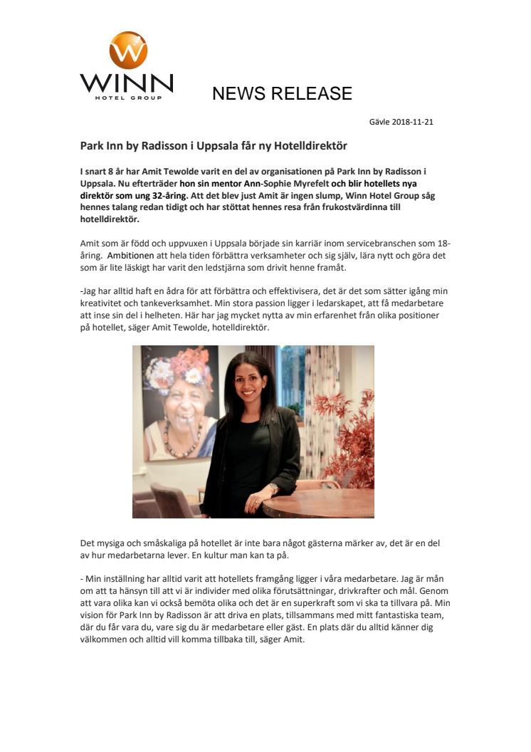 -Det känns fantastiskt kul att i sann Winn-anda lyfta en engagerad medarbetare som Amit, då hon utvecklats i vår organisation. I Ann-Sophie har hon haft en stark mentor som väglett henne under flera år, och då Winn i sin filosofi låter medarbetare växa genom ett närvarande ledarskap så är det naturligt att hon nu tar steget att bli direktör. Nu har vi två kompetenta direktörer i Uppsala som tillsammans kan fortsätta utveckla hotellen och Uppsala som destination, säger Sam Holmberg, Chief Operating Officer.