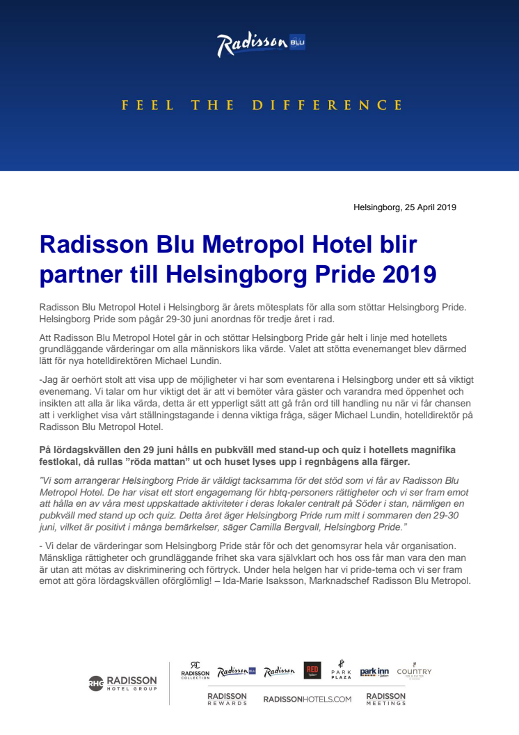 - Vi delar de värderingar som Helsingborg Pride står för och det genomsyrar hela vår organisation. Mänskliga rättigheter och grundläggande frihet ska vara självklart och hos oss får man vara den man är utan att mötas av diskriminering och förtryck. Under hela helgen har vi pride-tema och vi ser fram emot att göra lördagskvällen oförglömlig! – Ida-Marie Isaksson, Marknadschef Radisson Blu Metropol.