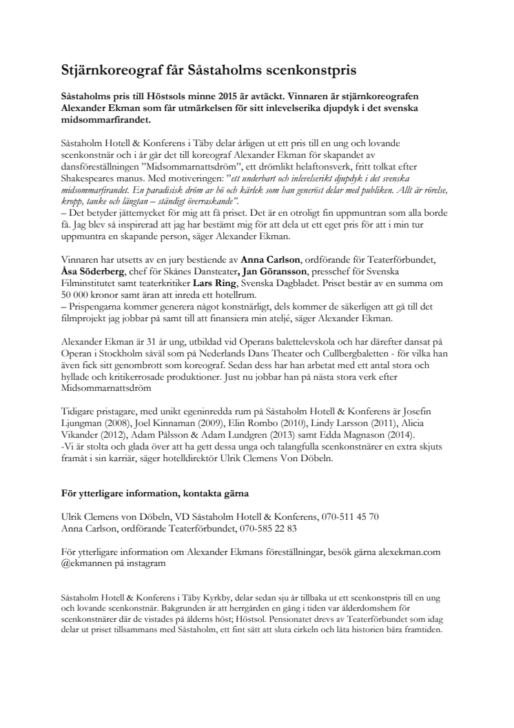 Såstaholm Hotell & Konferens i Täby delar årligen ut ett pris till en ung och lovande scenkonstnär och i år går det till koreograf Alexander Ekman för skapandet av dansföreställningen ”Midsommarnattsdröm”, ett drömlikt helaftonsverk, fritt tolkat efter Shakespeares manus. Med motiveringen: ”ett underbart och inlevelserikt djupdyk i det svenska midsommarfirandet. En paradisisk dröm av hö och kärlek som han generöst delar med publiken. Allt är rörelse, kropp, tanke och längtan – ständigt överraskande”.