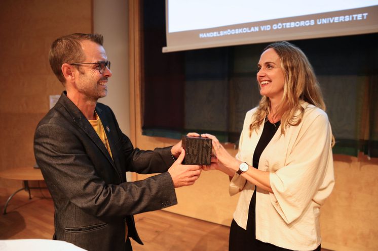 Oskar Broberg, vicedekan för utbildningsfrågor vid Handelshögskolan tar emot replika av årets priskub från WIN WIN Gothenburg Sustainability Awards verksamhetschef Sara Larsson.