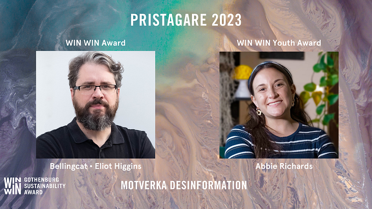 Världsledande WIN WIN Gothenburg Sustainability Award, och prissumman på 1 miljon kronor, går i år till det internationella nätverket Bellingcat – med grundaren Eliot Higgins i spetsen. Bellingcat är ett nätverk av grävande journalister som kämpar mot desinformation, och deras avslöjanden har exponerat kritisk information om akuta globala frågor. Dotterpriset, WIN WIN Youth Award, tilldelas i år desinformationsexperten sociala medie-stjärnan Abbie Richards, hjärnan bakom The Conspiracy Chart och en viktig kraft för att öka ungas motståndskraft mot desinformation.
