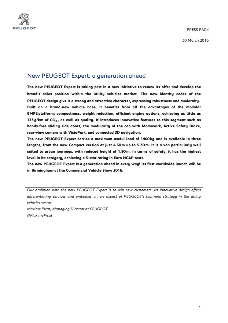 Med nya Expert siktar Peugeot på att befästa sin starka position på marknaden och vinna många nya kunder. Det breda utbudet av volymskåp- och chassibilar med olika påbyggnationer och inredningar och den höga lastförmågan på 1400 kg, upp till 6,6 m3 lastutrymme och 4 meters lastlängd visar att nya Expert är ett verkligt styrkebesked från Peugeot.