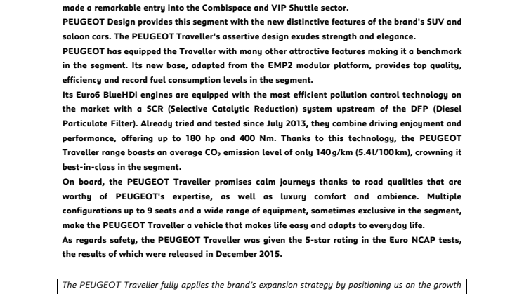 Nya Peugeot Traveller är en riktigt praktisk, rymlig och välutrustad bil som passar lika bra privat som i tjänsten. Bilen är byggd på koncernens modulära EMP2-baserade bottenplatta och Traveller åtnjuter därmed många egenskaper som nya 308 har prisats för, bland annat ett kompakt yttre med ett imponerande rymligt kupé- och bagageutrymme, klassledande bränsleförbrukning och hög kvalitet. Modellen erbjuds i tre olika varianter som är byggda för de olika målgruppernas specifika behov; Combispace, Shuttle and Business VIP.