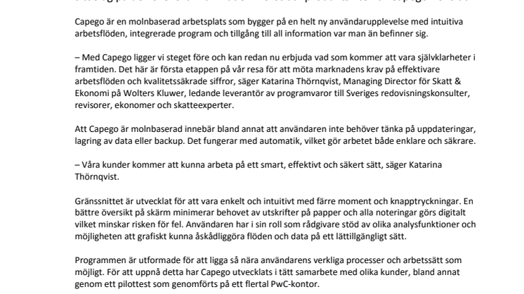 – Med Capego ligger vi steget före och kan redan nu erbjuda vad som kommer att vara självklarheter i framtiden. Det här är första etappen på vår resa för att möta marknadens krav på effektivare arbetsflöden och kvalitetssäkrade siffror, säger Katarina Thörnqvist, Managing Director för Skatt & Ekonomi på Wolters Kluwer, ledande leverantör av programvaror till Sveriges redovisningskonsulter, revisorer, ekonomer och skatteexperter.