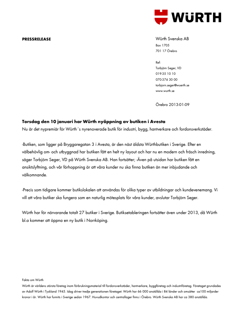 Torsdag den 10 januari har Würth nyöppning av butiken i Avesta