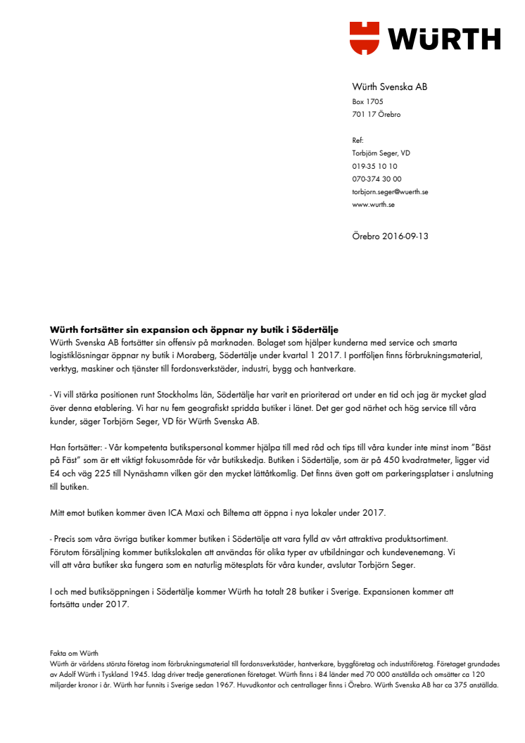Würth Svenska AB fortsätter sin offensiv på marknaden. Bolaget som hjälper kunderna med service och smarta logistiklösningar öppnar ny butik i Moraberg, Södertälje under kvartal 1 2017. I portföljen finns förbrukningsmaterial, verktyg, maskiner och tjänster till fordonsverkstäder, industri, bygg och hantverkare.