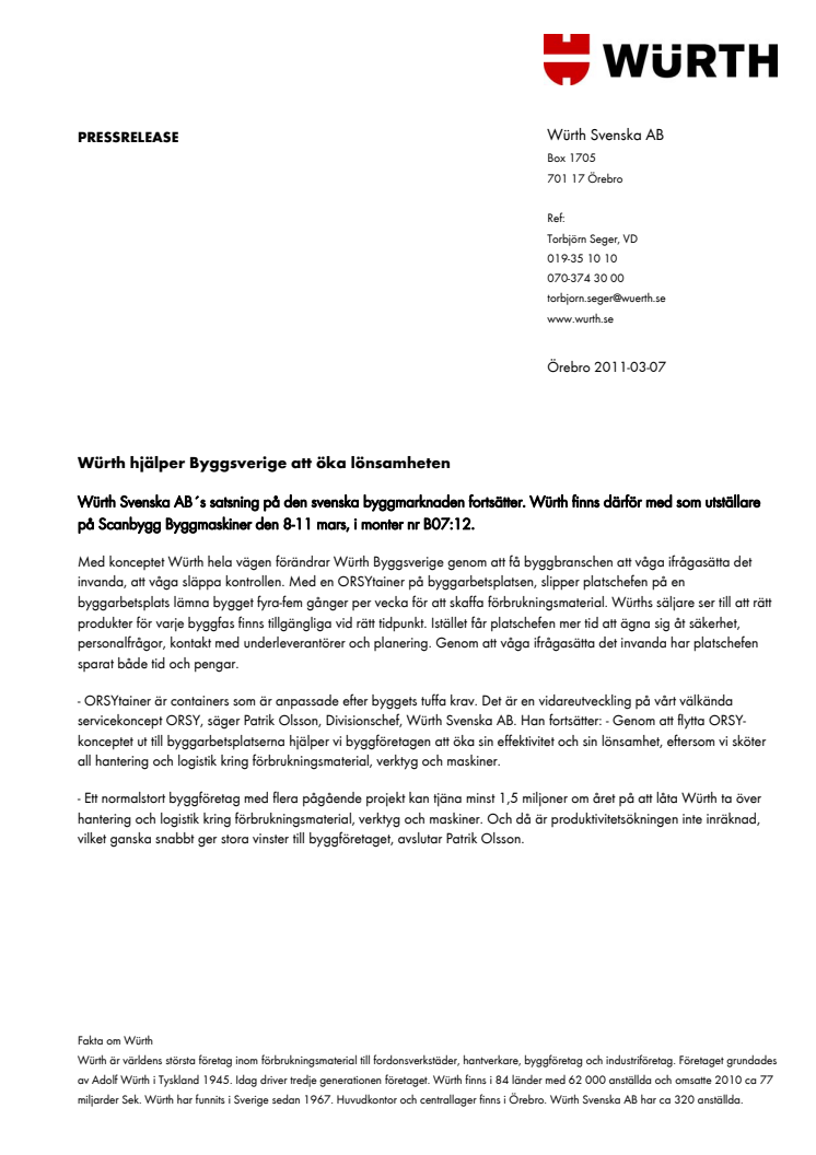 På Scanbygg den 8-11 mars visar Würth Svenska AB hur Byggsverige kan öka lönsamheten.