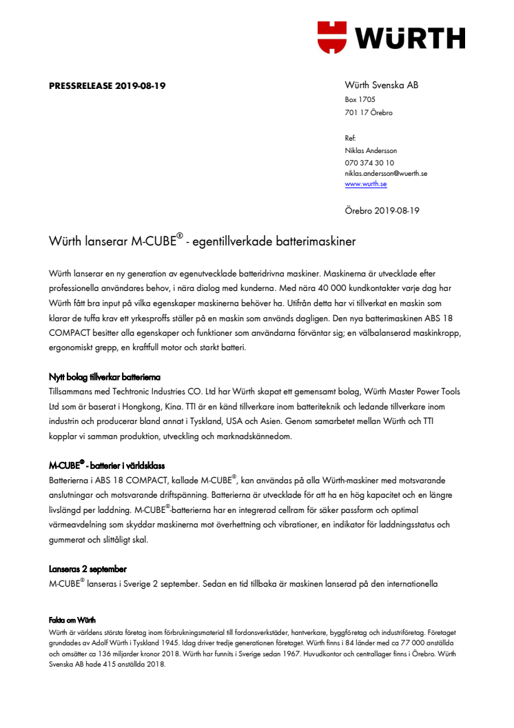 Würth lanserar M-CUBE® - egentillverkade batterimaskiner