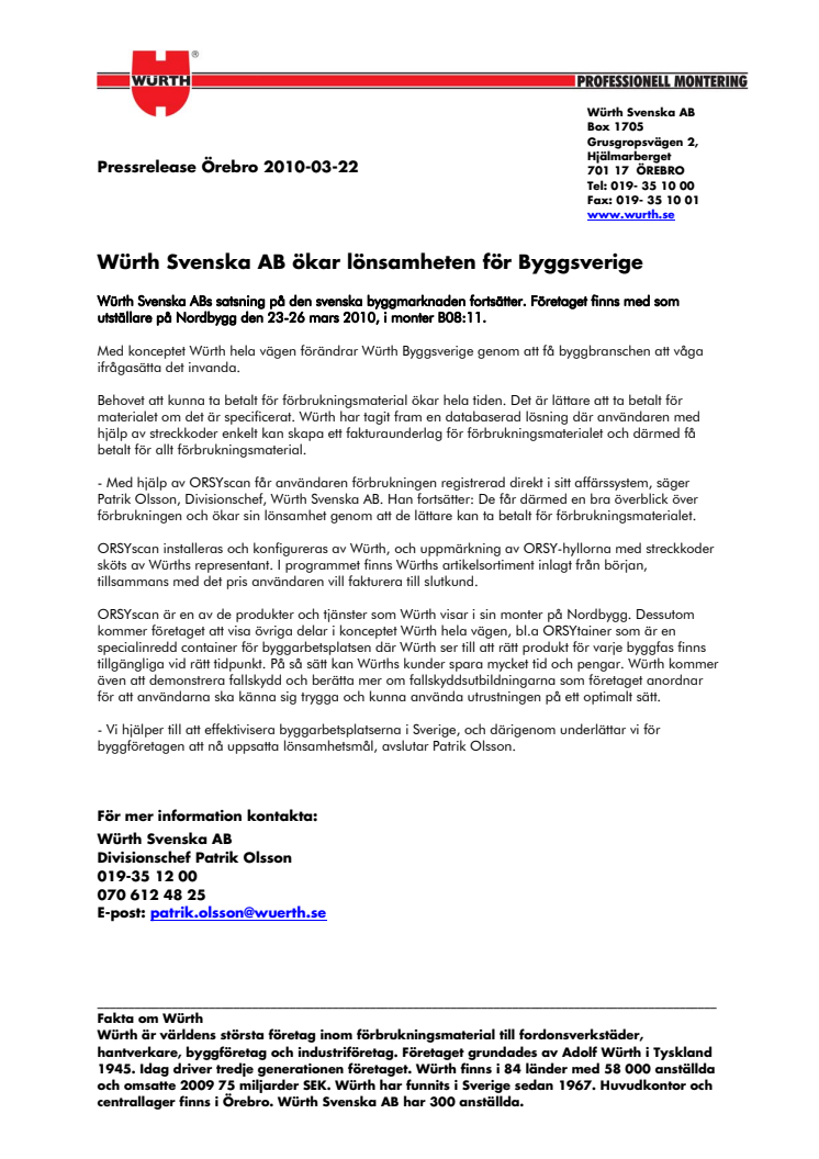 Würth Svenska ABs satsning på den svenska byggmarknaden fortsätter. Företaget finns med som utställare på Nordbygg den 23-26 mars 2010, i monter B08:11.