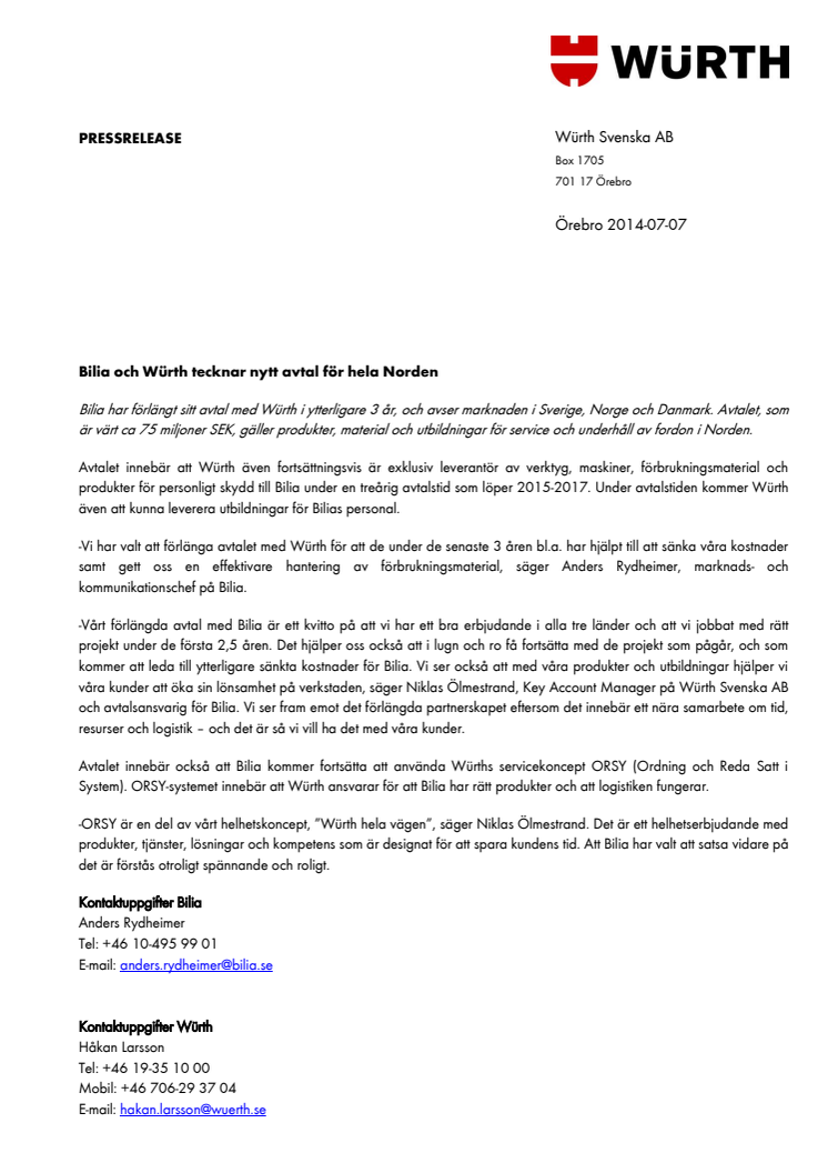 Bilia har förlängt sitt avtal med Würth i ytterligare 3 år, och avser marknaden i Sverige, Norge och Danmark. Avtalet, som är värt ca 75 miljoner SEK, gäller produkter, material och utbildningar för service och underhåll av fordon i Norden.