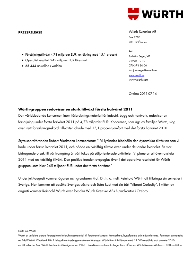 Den världsledande koncernen inom förbrukningsmaterial för industri, bygg och hantverk, redovisar en försäljning under första halvåret 2011 på 4,78 miljarder EUR. Koncernen, som ägs av familjen Würth, slog även nytt försäljningsrekord: tillväxten ökade med 15,1 procent jämfört med det första halvåret 2010.