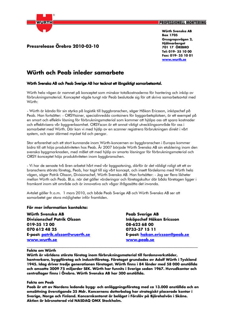 E-post: patrik.olsson@wuerth.se E-post: hakan.ericsson@peab.se