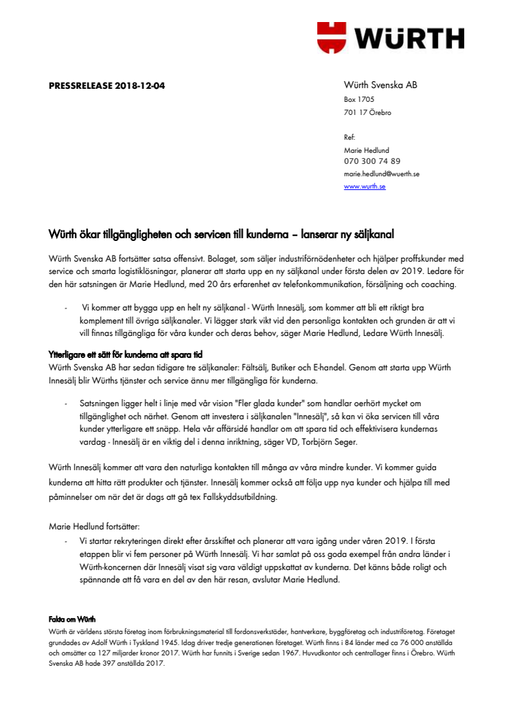 Würth Svenska AB fortsätter satsa offensivt. Bolaget, som säljer industriförnödenheter och hjälper proffskunder med service och smarta logistiklösningar, planerar att starta upp en ny säljkanal under första delen av 2019. Ledare för den här satsningen är Marie Hedlund, med 20 års erfarenhet av telefonkommunikation, försäljning och coaching.