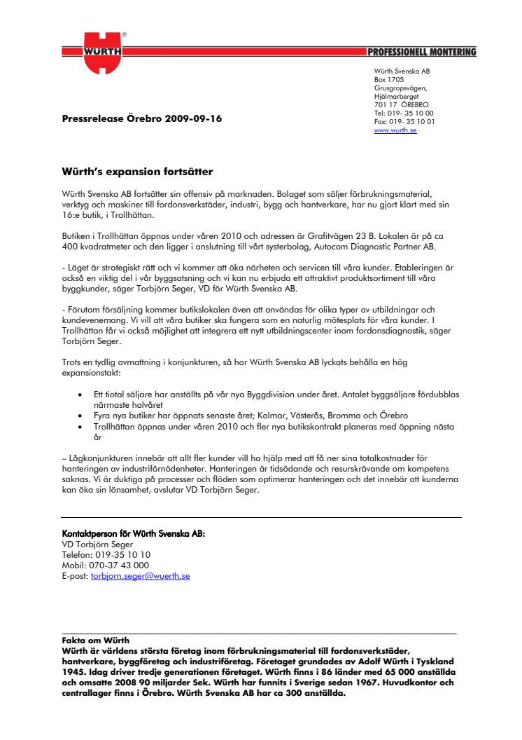 - Läget är strategiskt rätt och vi kommer att öka närheten och servicen till våra kunder. Etableringen är också en viktig del i vår byggsatsning och vi kan nu erbjuda ett attraktivt produktsortiment till våra byggkunder, säger Torbjörn Seger, VD för Würth Svenska AB.