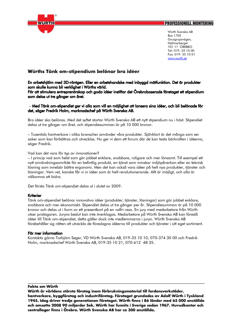 När många andra företag drar ner, satsar Örebrobaserade Würth Svenska AB hårdare än någonsin. Würth Svenska AB har nyligen startat sin marknadssatsning "Tänk om", där syftet är att skapa bättre förståelse för vilka produkter och tjänster som erbjuds inom "Würth hela vägen". Satsningen kompletteras med TV- och radioreklam.