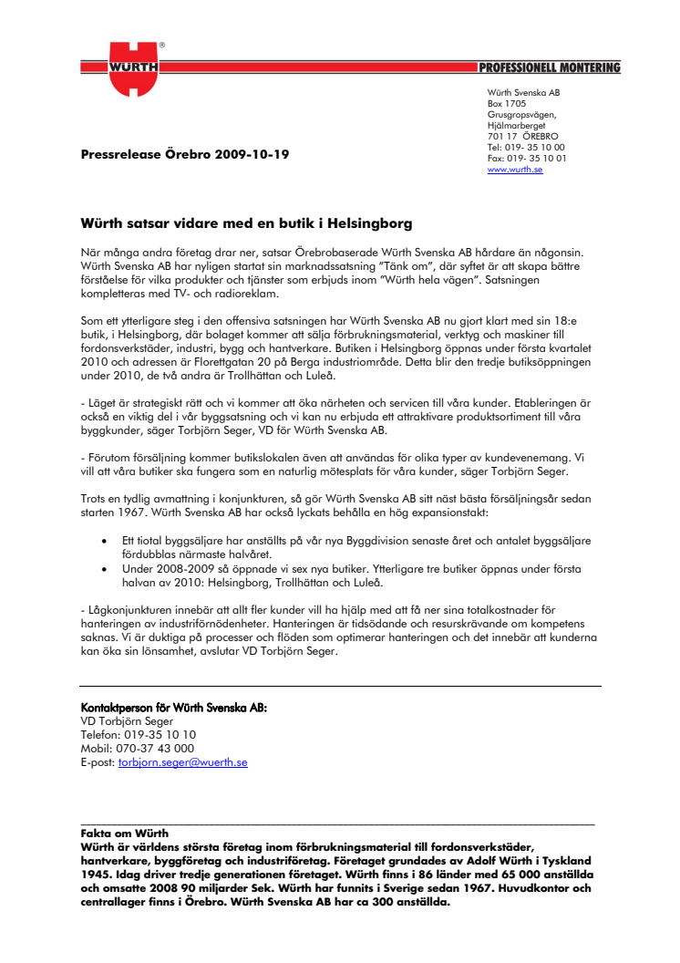 Som ett ytterligare steg i den offensiva satsningen har Würth Svenska AB nu gjort klart med sin 18:e butik, i Helsingborg, där bolaget kommer att sälja förbrukningsmaterial, verktyg och maskiner till fordonsverkstäder, industri, bygg och hantverkare. Butiken i Helsingborg öppnas under första kvartalet 2010 och adressen är Florettgatan 20 på Berga industriområde. Detta blir den tredje butiksöppningen under 2010, de två andra är Trollhättan och Luleå.