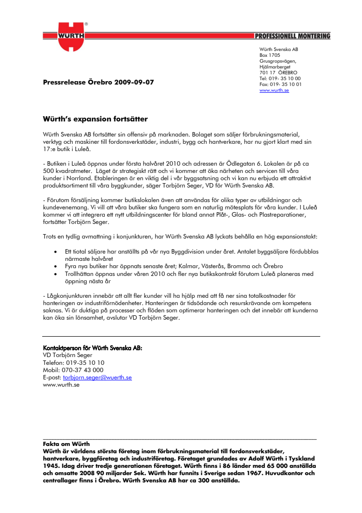 - Butiken i Luleå öppnas under första halvåret 2010 och adressen är Ödlegatan 6. Lokalen är på ca 500 kvadratmeter. Läget är strategiskt rätt och vi kommer att öka närheten och servicen till våra kunder i Norrland. Etableringen är en viktig del i vår byggsatsning och vi kan nu erbjuda ett attraktivt produktsortiment till våra byggkunder, säger Torbjörn Seger, VD för Würth Svenska AB.