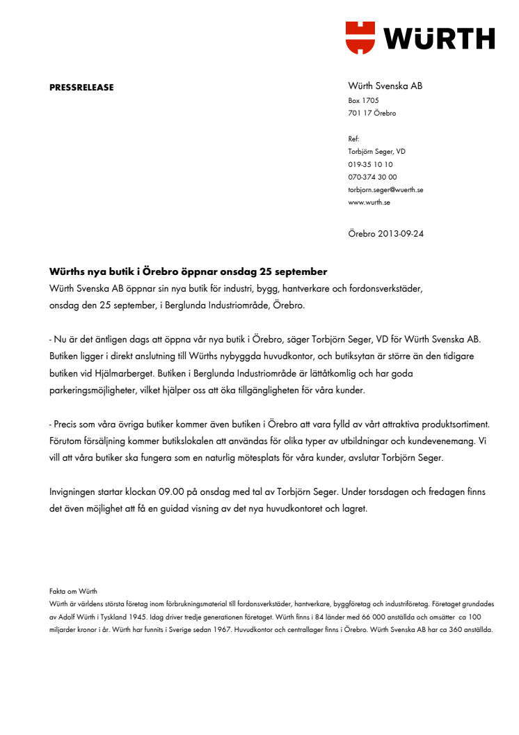 Würths nya butik i Örebro öppnar onsdag 25 september