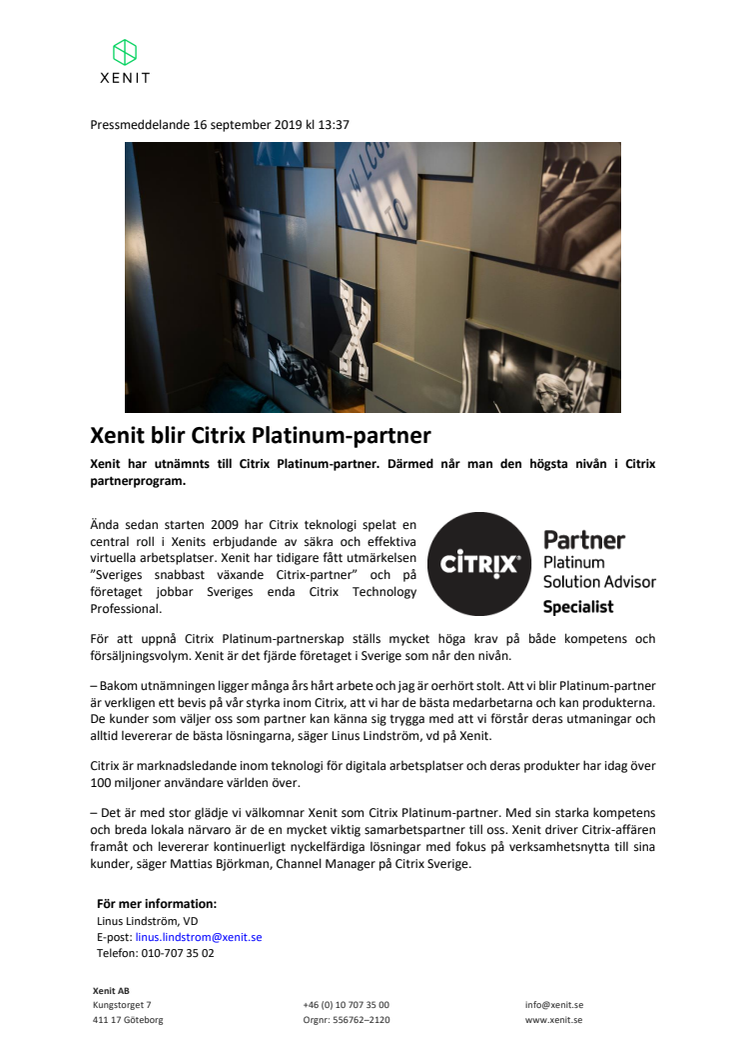 Xenit har utnämnts till Citrix Platinum-partner. Därmed når man den högsta nivån i Citrix partnerprogram.
