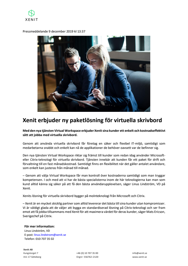 Med den nya tjänsten Virtual Workspace erbjuder Xenit sina kunder ett enkelt och kostnadseffektivt sätt att jobba med virtuella skrivbord.