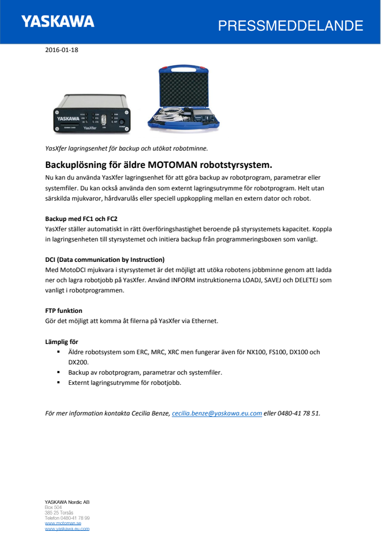 YasXfer lagringsenhet för backup och utökat robotminne förenklar arbetet med äldre MOTOMAN robotsystem. Använd den för att göra backup av robotprogram, parametrar eller systemfiler. Du kan också använda den som externt lagringsutrymme för robotjobb. Helt utan särskilda mjukvaror, hårdvarulås eller speciell uppkoppling mellan en extern dator och robot!