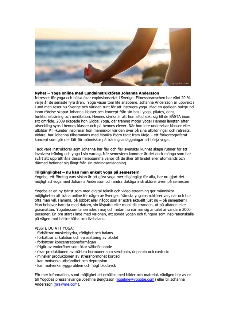 Intresset för yoga och hälsa ökar explosionsartat i Sverige. Fitnessbranschen har växt 20 % varje år de senaste fyra åren. Yoga växer tom lite snabbare. Johanna Andersson är uppväxt i Lund men reser nu Sverige och världen runt för att instruera yoga.