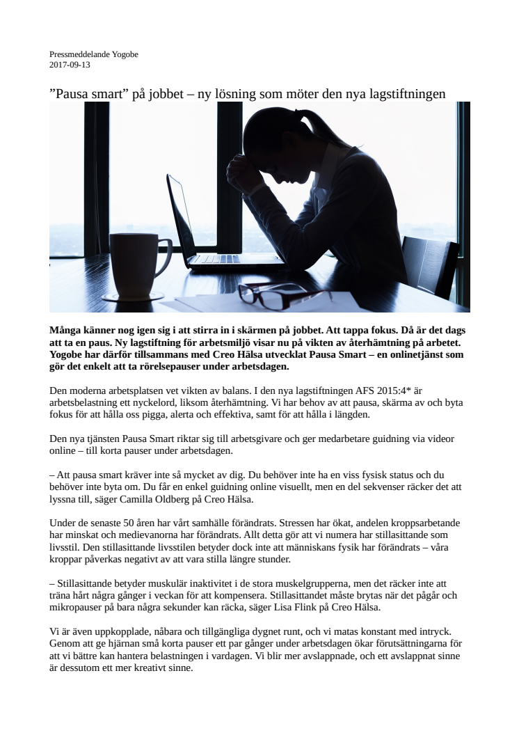 Många känner nog igen sig i att stirra in i skärmen på jobbet. Att tappa fokus. Då är det dags att ta en paus. Ny lagstiftning för arbetsmiljö visar nu på vikten av återhämtning på arbetet. Yogobe har därför tillsammans med Creo Hälsa utvecklat Pausa Smart – en onlinetjänst som gör det enkelt att ta rörelsepauser under arbetsdagen.