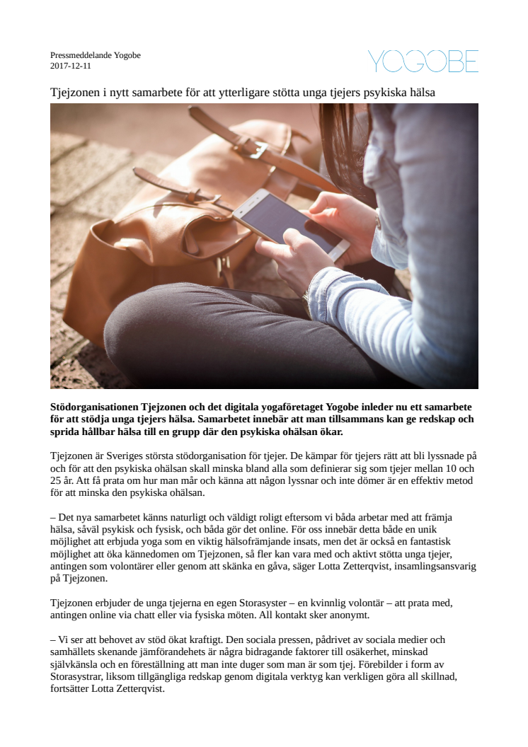 Stödorganisationen Tjejzonen och det digitala yogaföretaget Yogobe inleder nu ett samarbete för att stödja unga tjejers hälsa. Samarbetet innebär att man tillsammans kan ge redskap och sprida hållbar hälsa till en grupp där den psykiska ohälsan ökar.