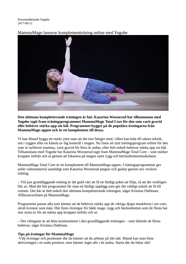 Den ultimata kompletterande träningen är här. Katarina Woxnerud har tillsammans med Yogobe tagit fram träningsprogrammet MammaMage Total Core för den som varit gravid eller behöver stärka upp sin bål. Programmet bygger på de populära övningarna från MammaMage-appen och är ett komplement till dessa.