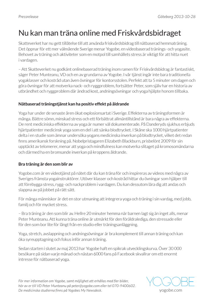 Skatteverket har nu gett tillåtelse till att använda friskvårdsbidrag till nätbaserad hemmaträning. Det öppnar för ett mer välmående Sverige menar Yogobe, en videobaserad tränings- och yogasite. Behovet av träning och aktiviteter som en motpol till samhällets stress är viktigt för att hitta balans i vardagen.