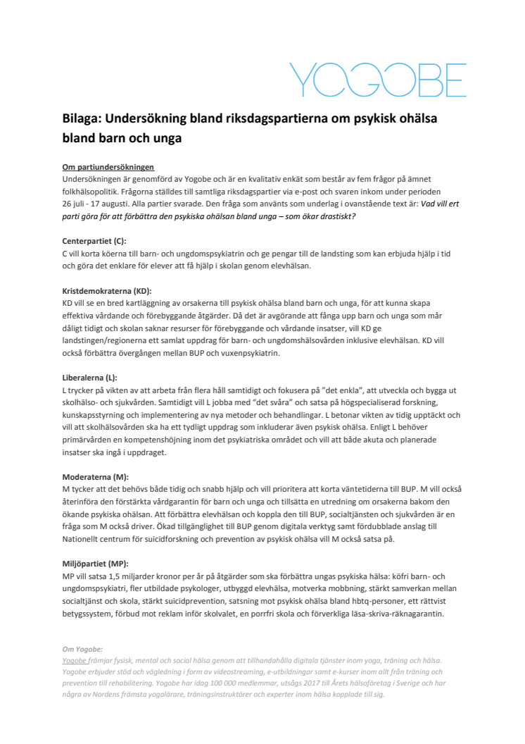 Undersökningen är genomförd av Yogobe och är en kvalitativ enkät som består av fem frågor på ämnet folkhälsopolitik. Frågorna ställdes till samtliga riksdagspartier via e-post under perioden 26 juli - 17 augusti. Alla partier svarade. Den fråga som använts som underlag i ovanstående text är: Vad vill ert parti göra för att förbättra den psykiska ohälsan bland unga – som ökar drastiskt?