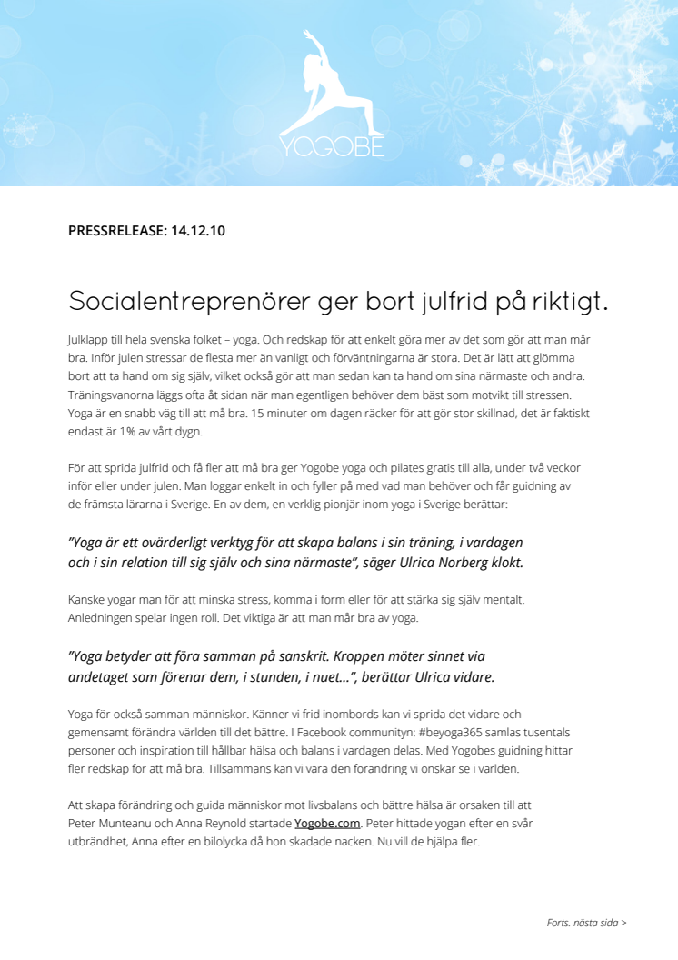 För att sprida julfrid och få fler att må bra ger Yogobe yoga och pilates gratis till alla, under två veckor inför eller under julen. Man loggar enkelt in och fyller på med vad man behöver och får guidning av de främsta lärarna i Sverige. En av dem, en verklig pionjär inom yoga i Sverige berättar:
