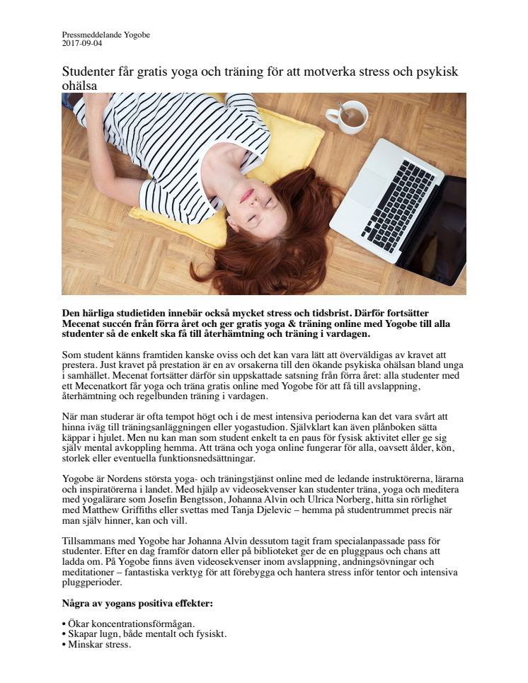 Den härliga studietiden innebär också mycket stress och tidsbrist. Därför fortsätter Mecenat succén från förra året och ger gratis yoga & träning online med Yogobe till alla studenter så de enkelt ska få till återhämtning och träning i vardagen.