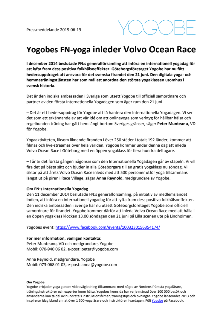 – I år är det första gången någonsin som den Internationella Yogadagen går av stapeln. Vi vill fira det på bästa sätt och bjuder in alla Göteborgare till en gratis yogaklass nu söndag. Vi siktar på att årets Volvo Ocean Race inleds med att 500 personer utför yoga tillsammans längst ut på piren i Race Village, säger Anna Reynold, medgrundare av Yogobe.