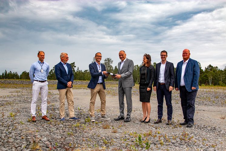Kontraktet om marken vid Landvetter räcks över mellan Jesper Sandahl, Transaction Manager och vice VD Swedavia Real Estate samt Volker Poßögel, vd för Zeppelin Nordics samt Zeppelin Sverige AB.