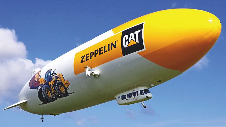 Den klassiska zeppelinaren med en Cat 982M-hjullastare och logotyp. Zeppelin GmbH ägs av stiftelsen Zeppelin-Stiftung samt Luftschiffbau Zeppelin GmbH. Stiftelsen grundades av Ferdinand von Zeppelin 1908.
